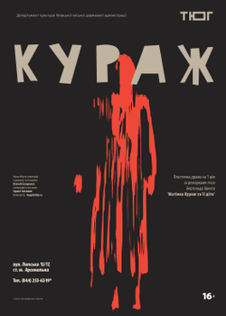 П’єса була задумана Бертольдом Брехтом як антивоєнний твір, адже написана упродовж 1938-1939 років. Працюючи над нею, він уявляв як зі сцени різних театрів пролунає попередження про загрози, що приносить війна. Від 2019 року вистава «Кураж» зайняла чільне місце в репертуарі Театру юного глядача на Липках. Перерва в показі вистави зумовлена початком війни 2022 року. Поновлення вистави приурочене 3-х річчю повномасштабного вторгнення рф в Україну. Вперше постановка була здійснена режисером у 2013 році на сцені Навчального театру Національного університету театру, кіно і телебачення ім. І. КарпенкаКарого, і, як виявилось, стала пророчою. Коли режисер і виконавець однієї з ролей Олексій Скляренко втілював свій задум вистави, він не міг передбачити, що йому особисто доведеться брати участь у бойових діях. У лютому 2022 року режисер Олексій Скляренко пішов добровольцем на війну, в складі ЗСУ пройшов Харківщину, Миколаївщину, Лиман. Його служба продовжується, а перебуваючи у відпустці, він, на звернення театру відновив виставу, яка має широкий попит у глядачів саме зараз, коли війна стала реальністю для кожного жителя України, а події відлунюють власним болем. Примітка Актори, що грали в попередньому складі вистави - Володимир Скорик та Вадим Пантус - служать у ЗСУ, а Володимир Ковбель за час воєнних дій пропав без вісти.